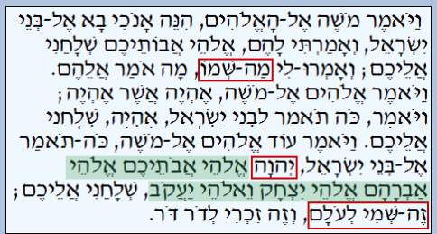 Jadi "God" mengidentifikasi Diri-Nya sebagai YEHOVAH (YHWH), dan dengan jelas menjelaskan berbagai hal dengan mengidentifikasi Diri-Nya sebagai "God" Abraham, "God" Ishak, dan "God" Yakub.